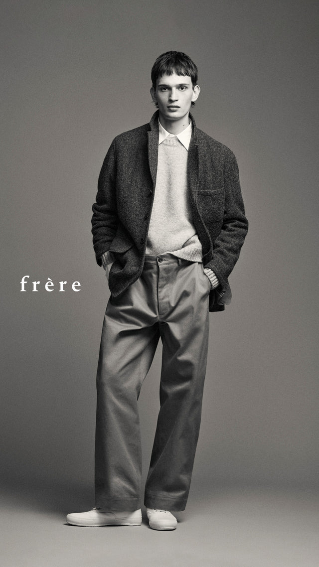 « Frère is a collection of clothing for men. Frère is also an idea: getting dressed is a cultural statement that testifies to the films, albums, books that we love. Frère is also an image. Or rather a series of images. Of a shirt collar softened and twisted by time. Of a white rib knit tank top casually fallen at the foot of the bed. Or even of wool gabardine city trousers breaking generously over a pair of well-loved canvas tennis shoes. Frère is unquestionably about elegance. Sometimes polished, often classic, always nonchalant, never nondescript. But Frère is above all an attitude, masculine, sensitive, offbeat, discreet, decisive, smiling, charming and simple in turn, from one moment to the next. Frère is all that at once. »