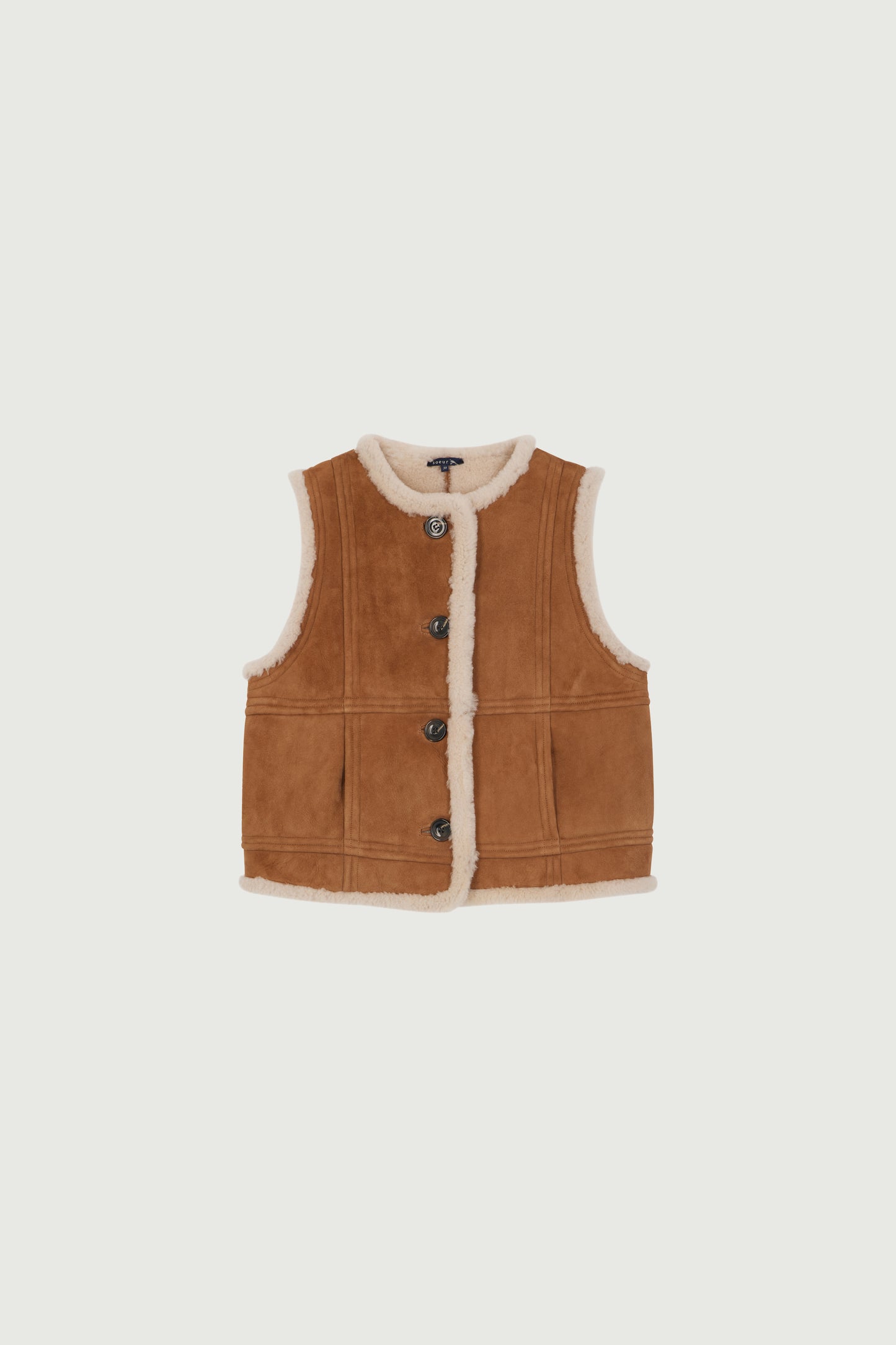 VILLAGE is a sleeveless shearling cardigan. Our sleeveless cardigans are a must-have for the Soeur wardrobe. The concealed front pockets add to its oversized and casual attitude.