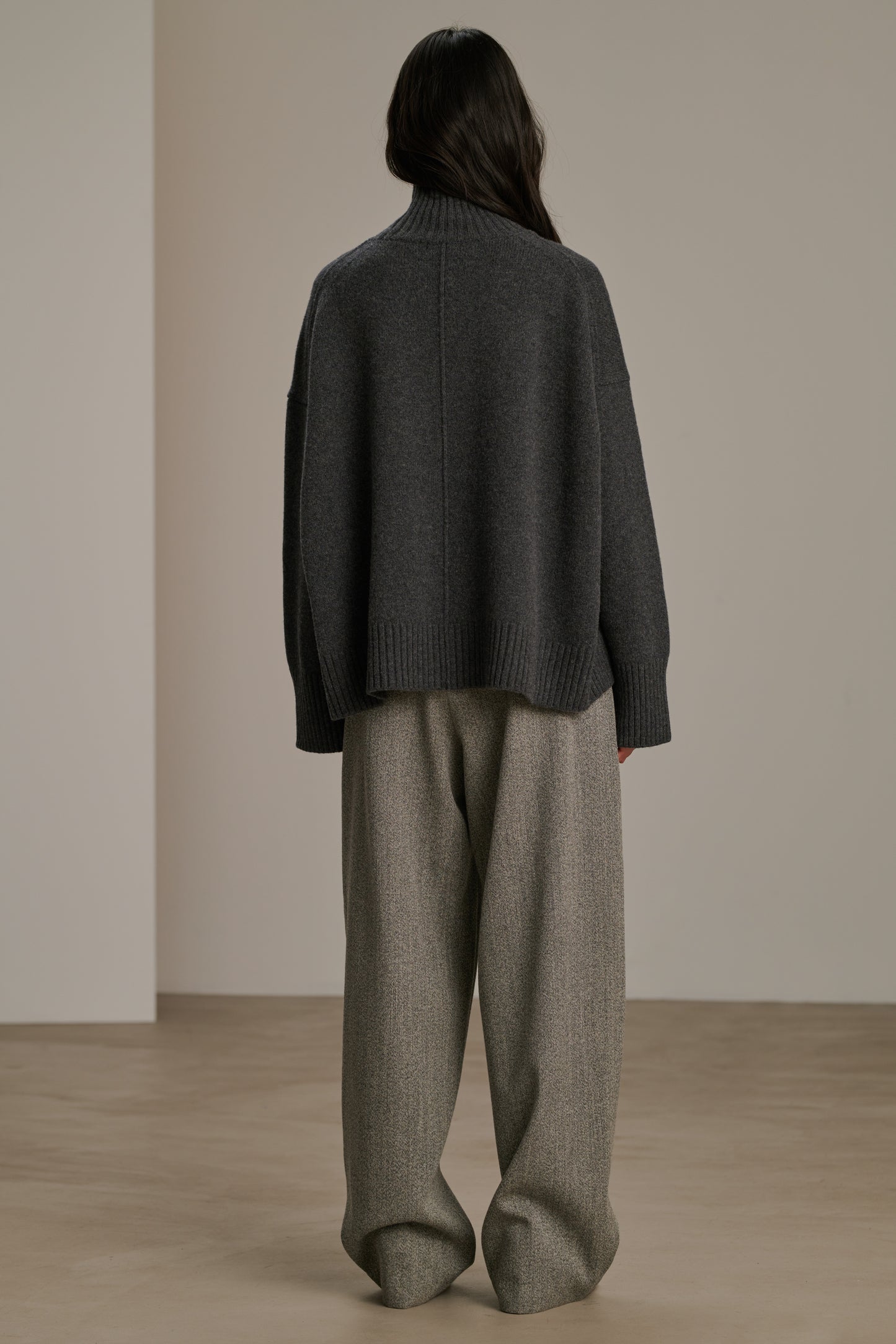 WILLIAM is a turtleneck jumper with long sleeves, knitted in merino wool yarn. It has a straight, oversized cut, and the sleeves are intentionally long to cover the base of the hand. Extra long and cocooning, it can be worn all winter over a pencil skirt or wide trousers.